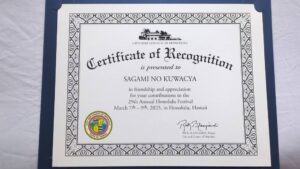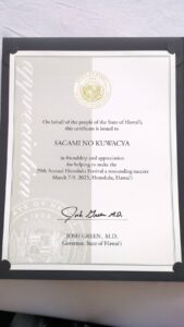 ハワイ州の知事とホノルル市の市長からハワイとの友好にご協力ありがとうの感謝状を頂きました。